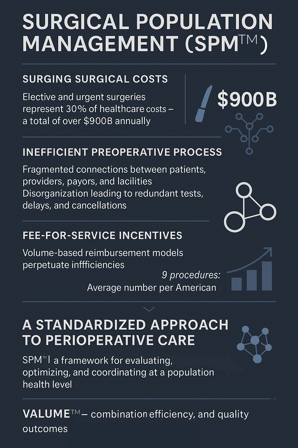 With the average American undergoing nine procedures during their lifetime, a more efficient and effective way of managing surgical care is needed. Surgical Population Management (SPM™) is a transformative care delivery framework that reimagines how surgical patients are evaluated, optimized, and coordinated across the perioperative continuum. By shifting from reactive, siloed interventions to a population health level strategy, SPM™ directly addresses the inefficiencies, redundancies, and safety risks that burden this patient cohort.